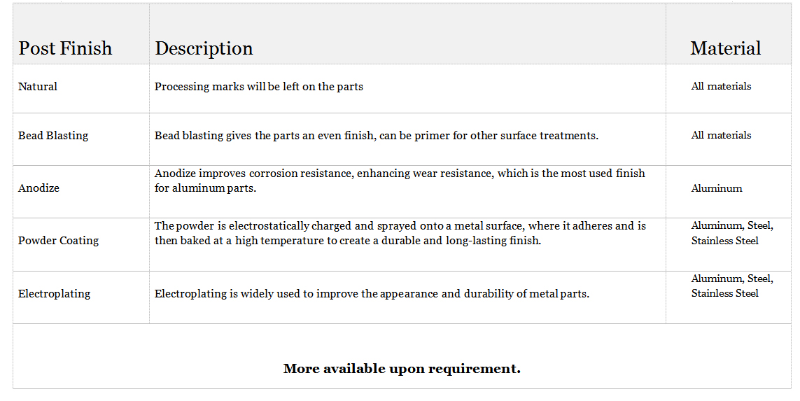 The surface finishes of CNC machining refers to the process of surface processing, treatment, and coating on CNC machined parts to improve the quality and performance of the parts' surfaces, enhance their corrosion resistance, wear resistance, fatigue resistance, and aesthetics.